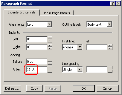 3. Choose the "Format | Paragraph..." menu command, or press Ctrl+Shift+G. Type the current font size (or another value in points) in the "Space > After" box: