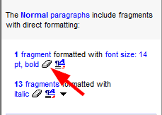 Each reported fragment with direct formatting is followed by a button that can be used to remove direct formatting of the fragment: