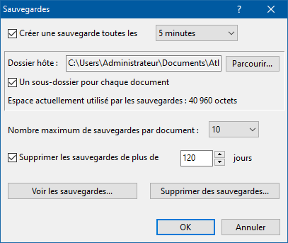 Créer une sauvegarde toutes les […] minutes/heures Un sous-dossier pour chaque document Espace actuellement utilisé par les sauvegardes Nombre maximum de sauvegardes par document |