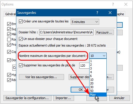 Vous pouvez spécifiez Max comme valeur pour ce Nombre maximum de sauvegardes par document :