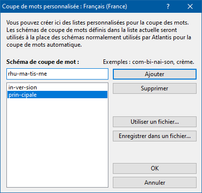 Le bouton Utiliser un fichier… vous permet de charger une liste de schémas de coupe de mots précédemment enregistrée.