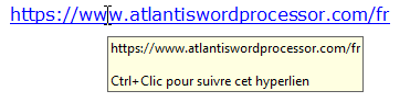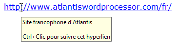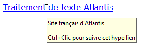 Lorsque vous placez le pointeur de votre souris sur un hyperlien, une infobulle s'affiche automatiquement. Par défaut, Atlantis utilise le nom du fichier, du signet ou de l'adresse électronique associé(e) à l'hyperlien. Vous pouvez cependant saisir un texte différent pour cette infobulle.