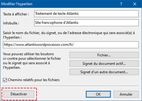 Comme indiqué plus haut, la boîte de dialogue Modifier l'hyperlien comprend un bouton supplémentaire, le bouton Désactiver. Cliquez sur ce bouton pour convertir en texte pur l'hyperlien en question. Seuls seront conservés le texte ou l'image initiale.