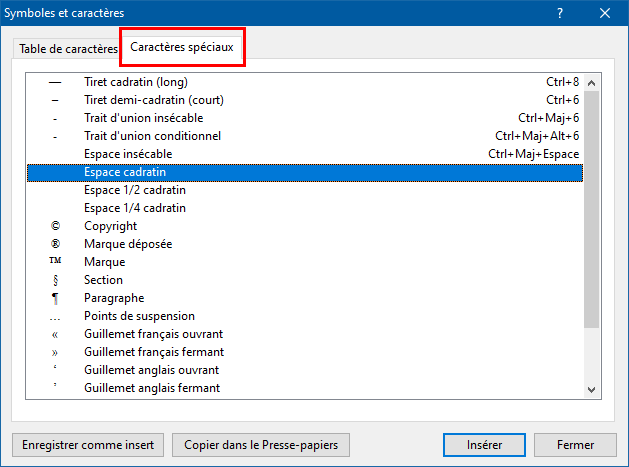 L'onglet "Caractères spéciaux" |