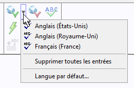 Chaque fois que vous sélectionnez un code de langue dans la liste de cette boîte de dialogue, le code de langue correspondant est inclus dans un historique des codes de langue déjà utilisés. Cet historique est plus rapide et plus pratique à utiliser. Vous n'avez plus besoin de faire défiler l'ensemble de la liste lorsque vous appliquez un code de langue déjà utilisé. Notez que le nombre d'éléments dans cet historique dépend de la valeur de l'option Nombre d'éléments dans les historiques des options globales d'Atlantis (commande de menu principal Outils | Options…, onglet Général). Cet historique se retrouve à 3 endroits différents :