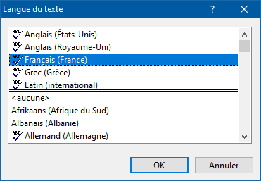 La boîte de dialogue Langue du texte contient la liste des langues disponibles sur votre système. Choisissez dans cette liste la langue à laquelle vous voulez associer la sélection en cours dans le document (ou le mot où se trouve le caret en l'absence de sélection).