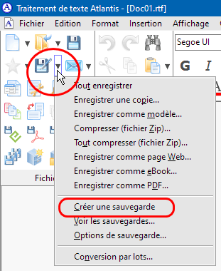 - utiliser la commande Créer une sauvegarde du menu déroulant ▼ associé au bouton de barre d'outils Enregistrer le document sous :