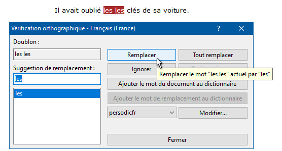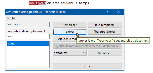 Lorsque cette option est active, tout mot redoublé est signalé comme une erreur potentielle. Notez que dans le cas du français, les formes pronominales comme "nous nous (sommes rencontrés)", "vous vous (êtes revus)" seront également signalées comme erreurs potentielles :