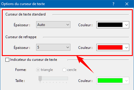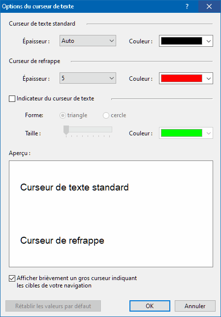 Cette boîte de dialogue s'ouvre lorsque vous cliquez sur le bouton Curseur de texte… sous l'onglet Accessibilité des options globales d'Atlantis que vous ouvrez avec le bouton