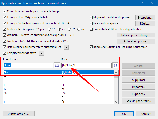 La fonction de remplacement de la correction automatique peut non seulement remplacer du texte mais peut en même temps appliquer une mise en forme à tout ou partie du texte de remplacement. Cela se fait à l'aide de balises HTML incluses dans le texte de remplacement. En voici un exemple :