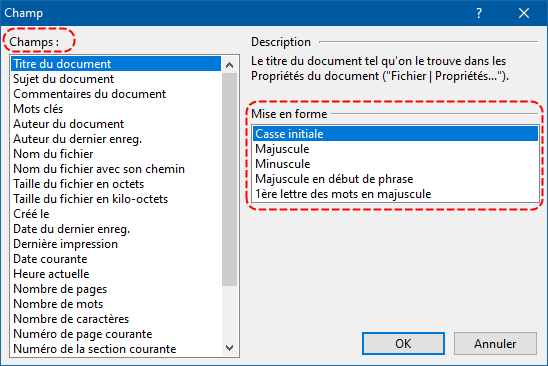 Remarque : Les diverses commandes de changement de casse font également partie des options associées aux champs Titre du document, Sujet du document, Commentaires du document, Mots clés, Auteur du document, Auteur du dernier enreg., Nom du fichier, Nom du fichier avec son chemin :