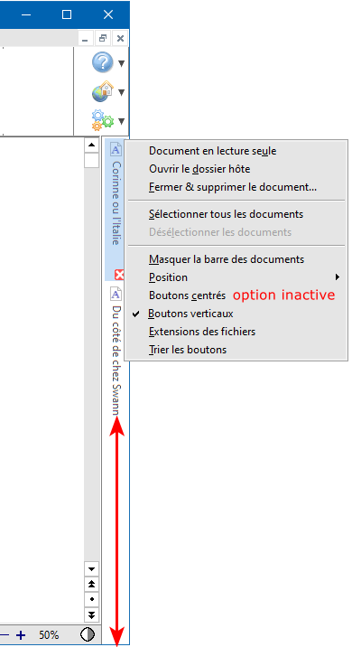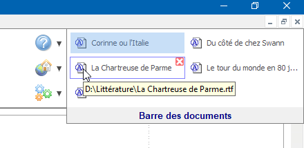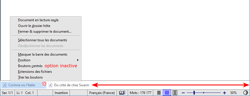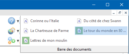 Par contre, quand cette option est désactivée, les boutons sont disposés de gauche à droite à l'intérieur de la barre des documents horizontale :