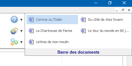 Lorsque la barre des documents est intégrée à droite des barres d'outils, et que beaucoup de documents sont ouverts, tous les boutons associés ne peuvent pas tenir sur la partie visible de la barre des documents. Il suffit alors de passer le pointeur de la souris au-dessus de la portion visible de la barre des documents pour qu'apparaissent les boutons restés invisibles jusque là :