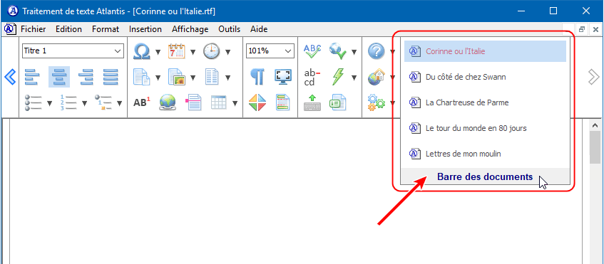 La barre des documents d'Atlantis fonctionne à bien des égards comme la barre des tâches de Windows. Mais au lieu d'afficher des applications, la barre des documents d'Atlantis affiche tous les documents actuellement ouverts dans Atlantis. Elle contient autant de boutons qu'il y a de documents ouverts :