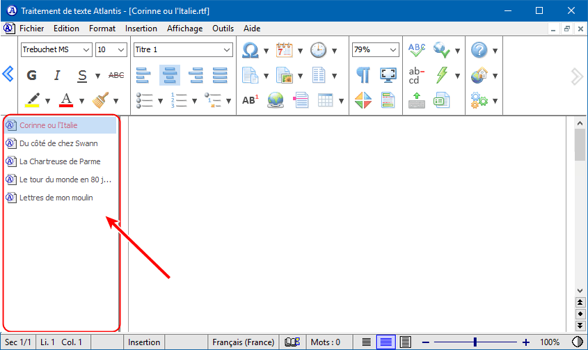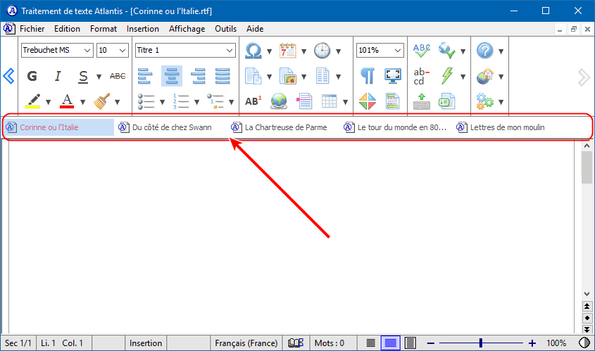 Chaque fois que vous ouvrez de nouveaux documents dans Atlantis, ils sont ajoutés les uns à la suite des autres de gauche à droite sur la barre des documents. La position de tel ou tel document sur la barre sera probablement sans importance lorsque peu de documents sont ouverts. Mais les choses pourront s'avérer différentes lorsqu'une grande variété de documents est ouverte. Dans ce cas-là, il se pourrait que vous vouliez déplacer les boutons de certains documents de façon à opérer des regroupements sur la barre. Cela se fera par simple glisser-déplacer. Voici comment procéder :