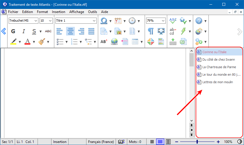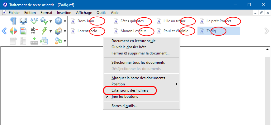 Notez d'ores et déjà les particularités suivantes concernant les boutons de la barre des documents d'Atlantis :