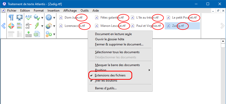 Vous pouvez demander à Atlantis de procéder automatiquement au tri alphabétique des noms de documents sur la barre des documents. Le menu contextuel de clic droit associé à la barre des documents contient une option dédiée :