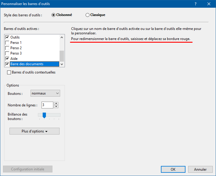 Si vous voulez qu'Atlantis affiche plus de boutons sur la partie visible de la barre des documents, il vous faut agrandir la taille de la barre des documents. Voyez la rubrique Agrandir ou réduire la taille de la barre des documents ci-dessus pour toutes précisions.