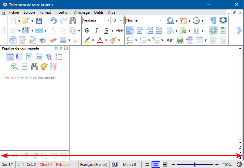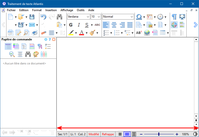 À l'inverse, lorsque cette même option est inactive, et que la fenêtre d'Atlantis comprend des éléments disposés sur sa gauche ou sur sa droite tels que le pupitre de commande ou les barres d'outils, la barre d'état a la même largeur que la fenêtre de document :