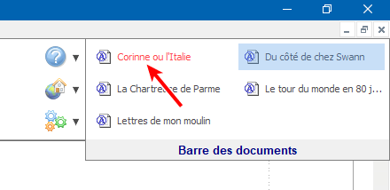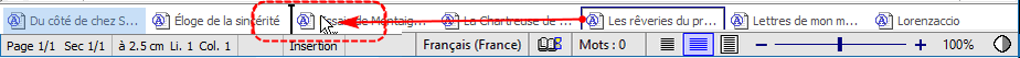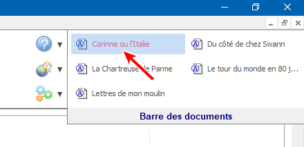 Lorsqu'il y a peu de documents ouverts, le plus simple pour afficher l'un ou l'autre des documents est de cliquer sur le bouton correspondant sur la barre des documents. Notez qu'un clic droit ouvre le menu contextuel associé à la barre des documents, mais qu'il sélectionne également le document visé.
