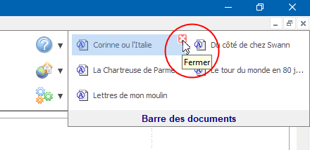 Si vous maintenez le pointeur de votre souris au dessus d'un bouton de la barre des documents, vous ferez apparaître un "x". Donnez un clic sur cet "x" pour fermer le document correspondant :