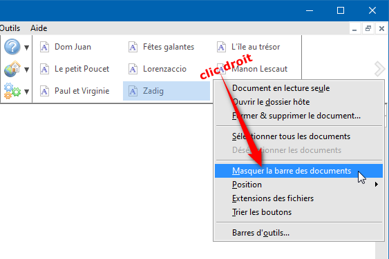 La barre des documents peut être masquée de deux manières. Vous pouvez, au choix :