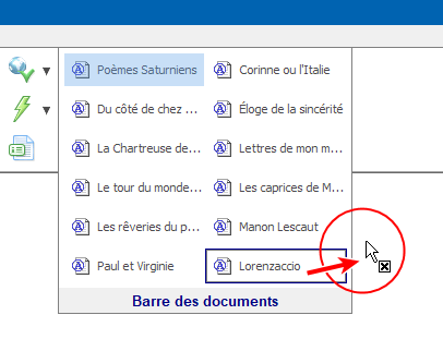 Voici comment procéder lorsque la barre des documents est intégrée dans la zone des barres d'outils :