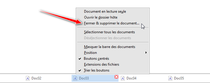 Pour désélectionner tous les boutons de barre des documents sélectionnés, utilisez la commande du menu contextuel de clic droit Désélectionner les documents (voir illustration ci-dessus).