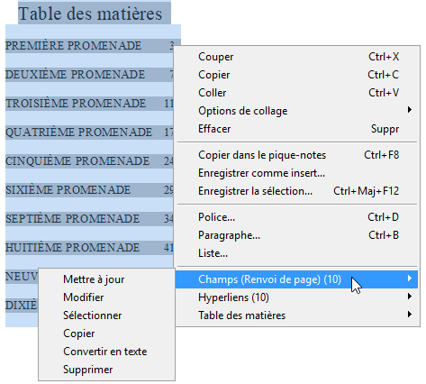Comme vous pouvez le constater dans l'illustration ci-dessus, les tables des matières construites automatiquement utilisent des champs Renvoi de page pour afficher les pages du document. Le menu contextuel de clic droit précise combien il y en a. Le sous-menu correspondant vous permet d'agir sur l'ensemble de ces champs. Vous pouvez les mettre à jour tous ensemble, les modifier, les sélectionner, les copier, les convertir en texte, les supprimer.