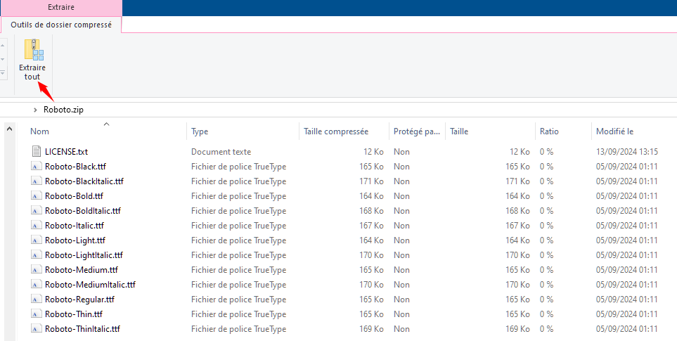 Une fois le fichier ZIP téléchargé, il vous faut extraire les fichiers qu'il contient :
