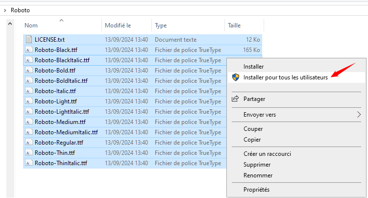 Sélectionnez ensuite les fichiers de polices de caractères, donnez un clic droit sur la sélection, et cliquez sur "Installer" ou bien sur "Installer pour tous les utilisateurs" dans le menu qui s'est ouvert :
