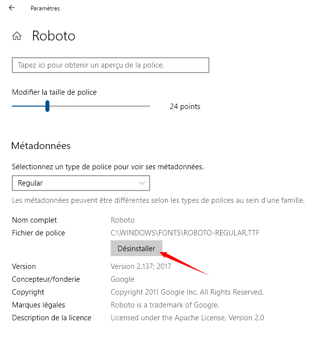 Sélectionnez ensuite la police de caractères que vous voulez désinstaller et cliquez sur "Désinstaller" :