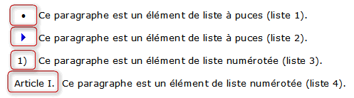 Quand vous demandez à Atlantis de mettre des paragraphes en forme de liste, des éléments spéciaux sont automatiquement insérés devant chacun des paragraphes pour les marquer en tant qu'éléments de liste. Nous appellerons les listes dont les éléments sont précédés d'une puce des listes à puces, les listes dont les éléments sont précédés d'une numérotation des listes numérotées :