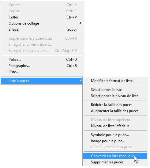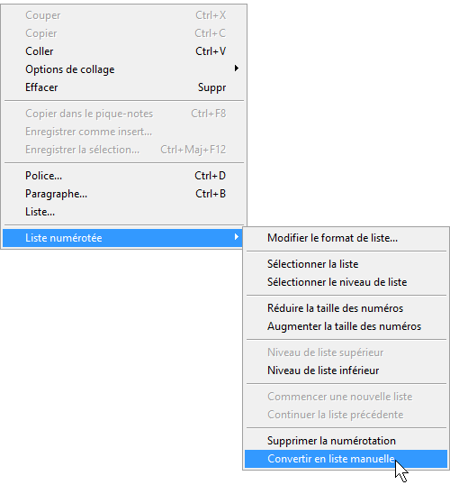 (barre d'outils contextuelle Liste numérotée), selon le type de liste. Vous pouvez également donner un clic du bouton droit de la souris sur la liste. Le menu contextuel qui s'ouvre alors comprend la commande Convertir en liste manuelle :