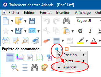 Le pupitre de commande d'Atlantis regroupe tous les outils et toutes les commandes de traitement de texte requises pour créer et gérer les principaux éléments constitutifs d'un document : les Titres, les Signets, les Index, les Sections, les Styles, les Listes, la Mise en forme, les Sélections. Les trois volets les plus à droite affichent la Recherche/Remplacement rapide, la Palette de formats et les Collections d'inserts.