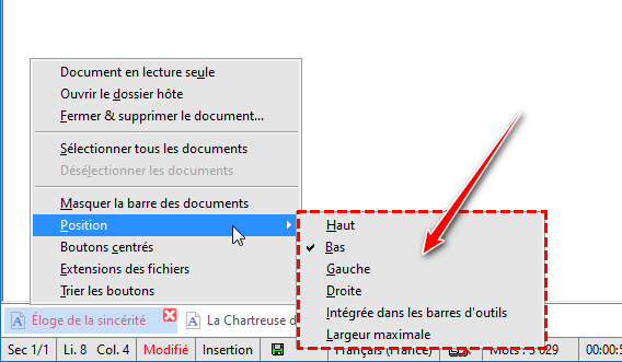 Vous pouvez également donner un clic droit sur la barre des documents quand elle est affichée, et utiliser le menu dédié :