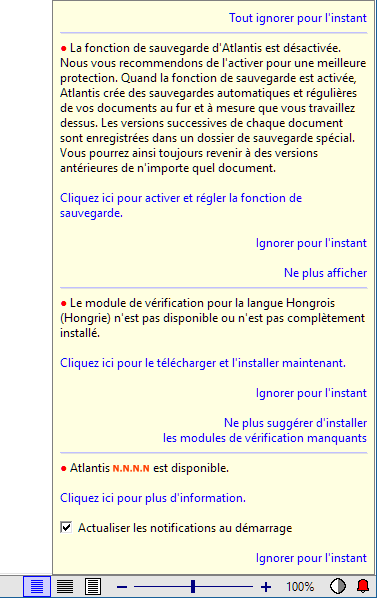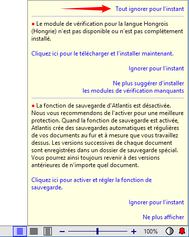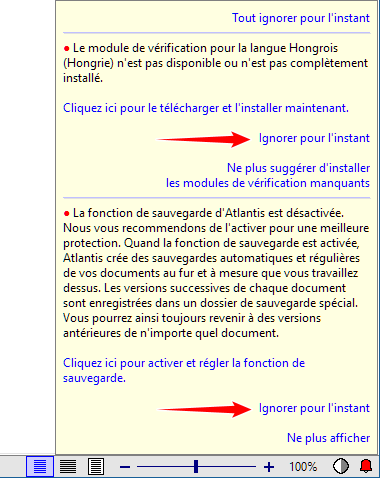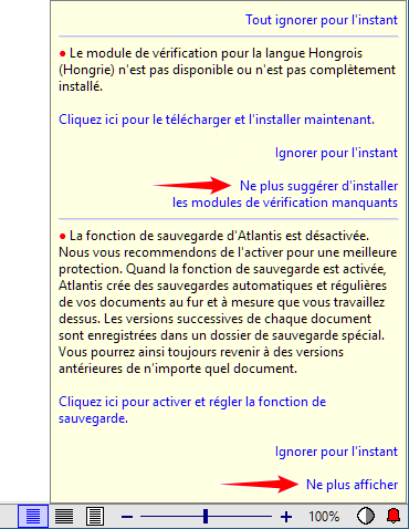 La plupart des notifications ne s'affichent que pendant la session de travail courante. Mais vous pouvez demander à Atlantis de ne plus afficher du tout certaines notifications : ce sont celles contenant les commandes "Ne plus suggérer" ou bien "Ne plus afficher" :