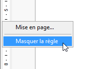 Un clic du bouton droit de votre souris sur un emplacement quelconque de la règle verticale fera apparaître un menu donnant aussi accès à la boîte de dialogue Mise en page. Vous pourrez masquer la règle verticale si vous le désirez :