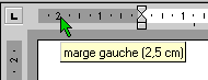 Notez qu'en plaçant le pointeur de votre souris sur l'un quelconque des éléments constitutifs des règles, vous ferez apparaître une infobulle contenant la valeur actuelle du paramètre correspondant. Par exemple, si vous placez le pointeur de la souris au-dessus de la zone de la règle correspondant à la marge gauche, vous obtiendrez la valeur actuelle de cette marge gauche :