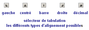 Le sélecteur de tabulations qui se trouve à gauche de la règle horizontale vous permet de choisir parmi tous les types d'alignement disponibles pour les taquets de tabulation. Cliquez autant de fois qu'il est nécessaire sur le bouton sélecteur pour faire apparaître le type de taquet voulu :