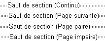 Ces différents sauts de section ferment tous la section précédente et ouvrent une nouvelle section. Selon le type de saut de section choisi, la nouvelle section se trouvera sur la même page (saut de type "continu"), sur la page suivante, sur la page paire suivante, sur la page impaire suivante. Ne s'imprime jamais. |