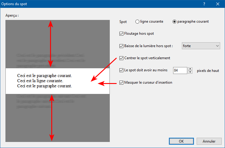 Le mode "spot" obscurcit l'affichage du document à l'exception du fragment de texte sur lequel vous travaillez :