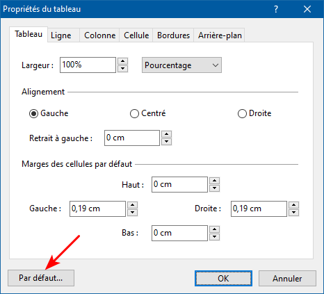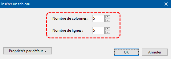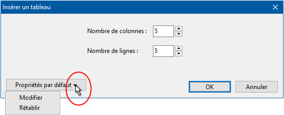 La boîte de dialogue Insérer un tableau comprend un menu déroulant Propriétés par défaut ▼ avec 2 options :