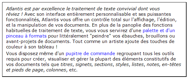 Le document intitulé Texte et images dans Atlantis (2).rtf est également disponible sur le site d'Atlantis à cette même page (Exemples & modèles de documents). Ce document illustre ce qu'il est possible de faire à l'intérieur de tableaux pour placer du texte autour d'images. Ce document peut être téléchargé directement en cliquant sur le lien suivant : Texte et images dans Atlantis (2).rtf.