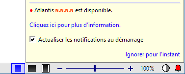 Atlantis peut vous faciliter cette tâche automatiquement. Lorsque l'option Actualiser les notifications au démarrage est active sous l'onglet Général des options globales d'Atlantis (commande Outils | Options…), et que vous lancez Atlantis sur votre système, Atlantis vous signale qu'une version de mise à jour est disponible en affichant une icône rouge dans sa propre zone de notification à droite de la barre d'état :