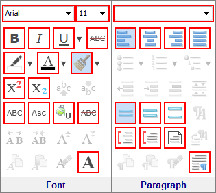 When the Format Brush is on, the red-framed buttons of the Font and Paragraph toolbars indicate the formatting currently borne by the Format Brush: