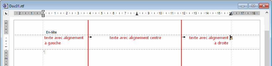 En plaçant le curseur d'insertion à gauche de la première marque de tabulation, vous pouvez insérer du texte avec alignement à gauche. En plaçant le curseur d'insertion à droite de la première marque de tabulation, vous pouvez insérer du texte avec alignement centré. En plaçant le curseur d'insertion à droite de la deuxième marque de tabulation, vous pouvez insérer du texte avec alignement à droite.