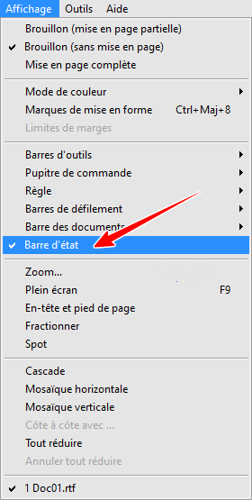 Notez qu'après avoir masqué la barre d'état, vous devrez obligatoirement passer par le menu principal Affichage si vous voulez la rétablir.