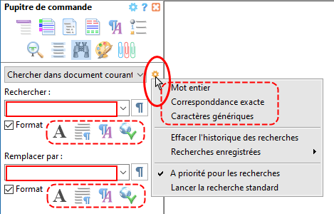 Les paramètres de l'opération de recherche/remplacement courante seront automatiquement inclus dans le schéma de recherche/remplacement ainsi enregistré. Ce sont les paramètres concernant le texte à rechercher, et éventuellement le texte de remplacement, ainsi que leur mise en forme (police, paragraphe, style, langue), et les options de recherche (Mot entier, Correspondance exacte, Caractères génériques) :